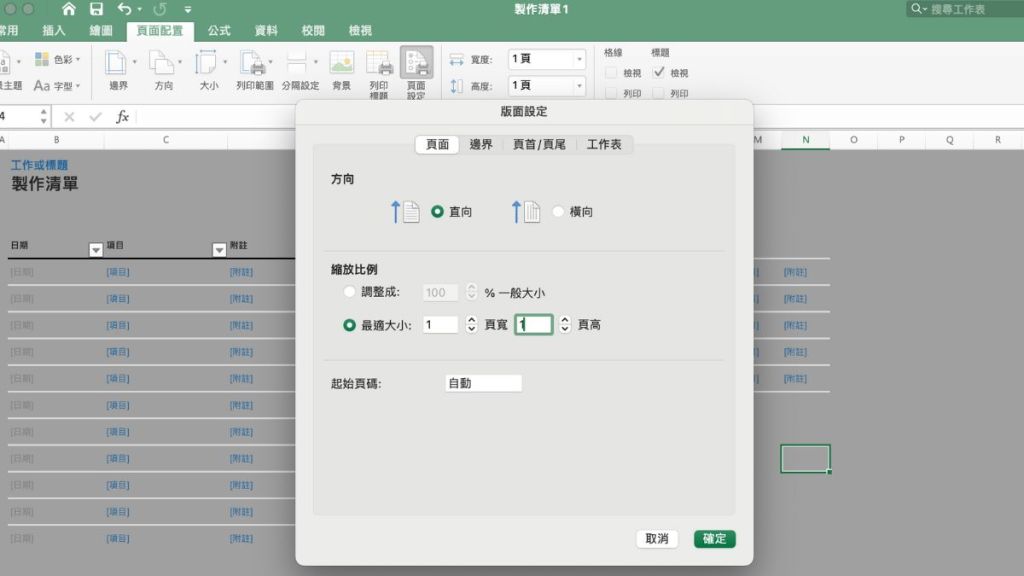 第二種方法是檢查版面設定是否有跑掉,請點選「版面配置>版面設定」,然後在頁面這裡把縮放比例調整成「一頁寬、一頁高」,按下確定鍵後再回到預覽列印查看,就會發現表格已經自動縮放成可一頁印製的大小,此時再列印就沒問題了。