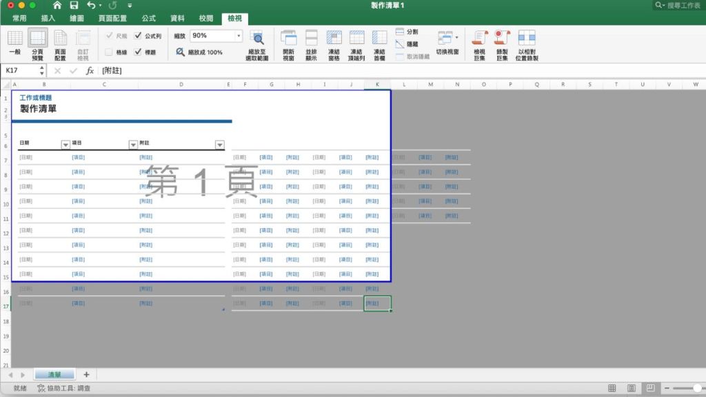 在列印Excel表格之前,建議養成習慣先從「分頁預覽」去查看表格範圍是否都已包含在一頁內(分頁預覽可在畫面右下角進行切換,或者在工具列中選擇檢視>分頁預覽)。