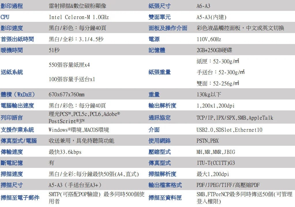RICOH MP C4000 事務機 彩色列印 / 影印每分鐘40頁 影印 / 列印 / 掃描 / 選配傳真 螢幕觸控板 / 介面客製化 支持行動裝置 智慧人體偵測 / 資料安全不洩漏 優惠中!歡迎來電洽詢!新機/福利機 數量有限! 立即諮詢 詳細規格 檔案下載 檔案名稱連結MP C4000 驅動程式點擊下載